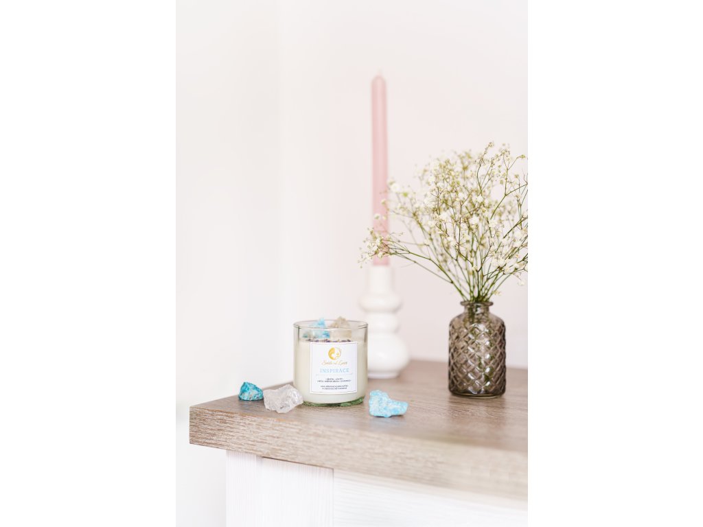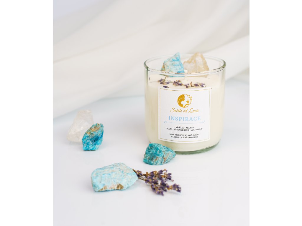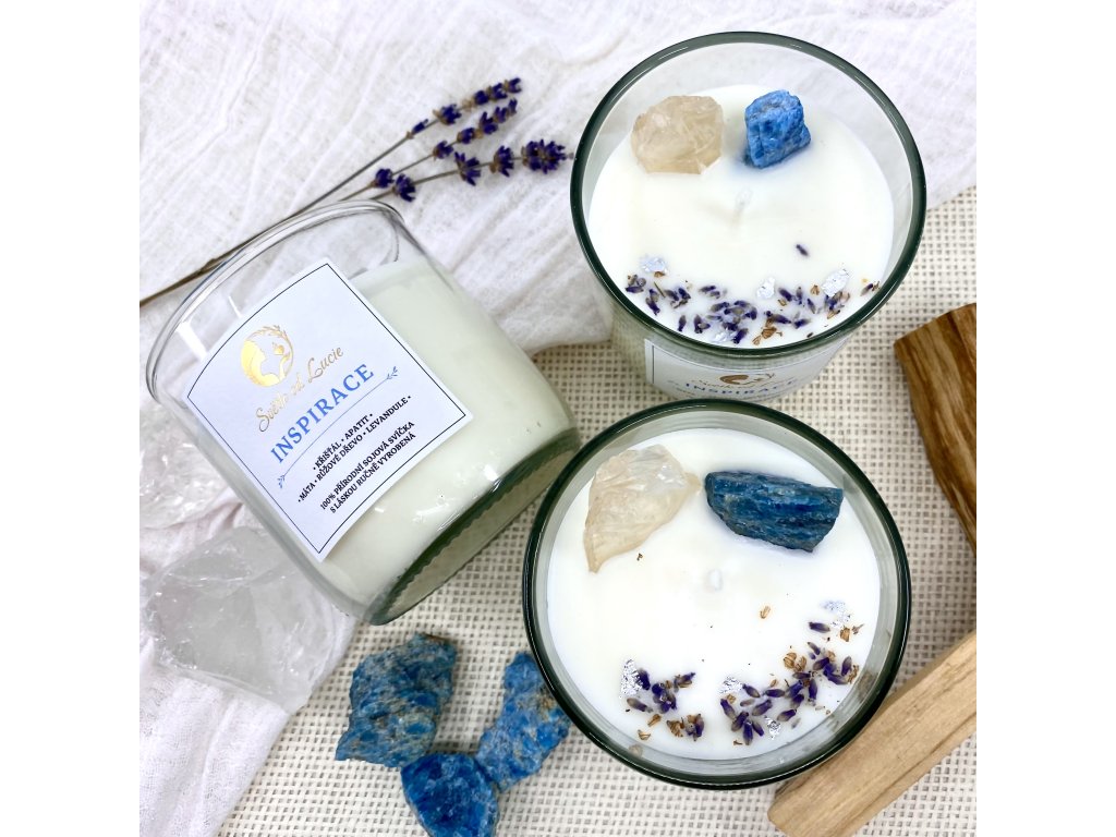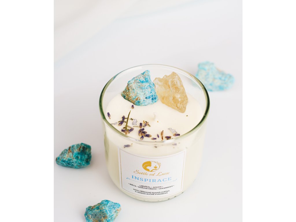 Ručně vyráběná sojová svíčka Inspirace s vůní růžového dřeva, máty a levandule jemně provoní váš domov.