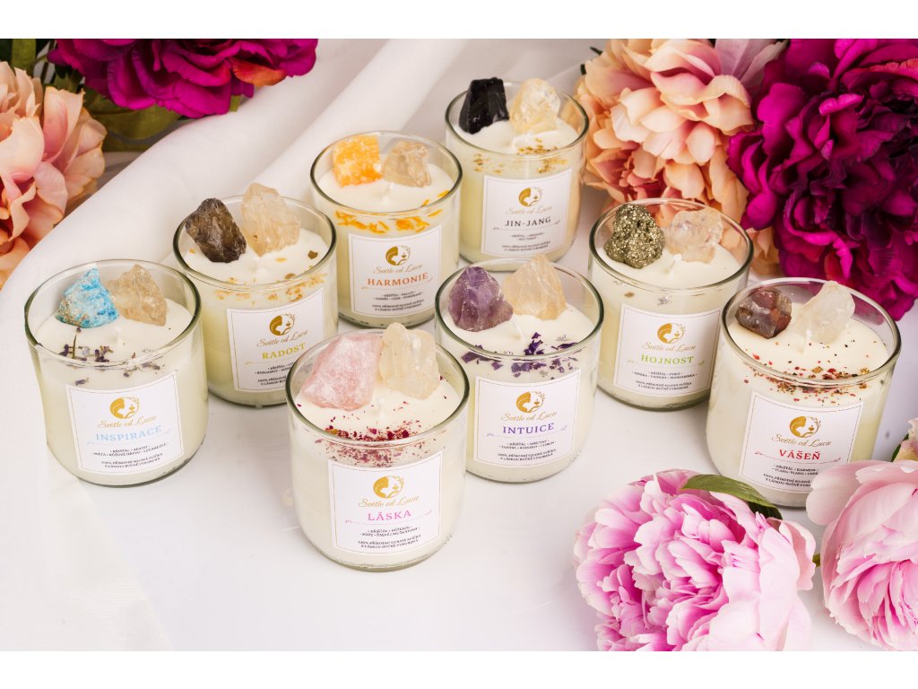 Použité minerály ve svíčkách jsou surové polodrahokamy, každý kousek je tak originál, stejně jako každá svíčka. Po zapálení svíčky a změknutí vosku kameny vyjměte, svíčka tak bude hořet rovnoměrně. Omyté minerály můžou samostatně zdobit váš domov.
