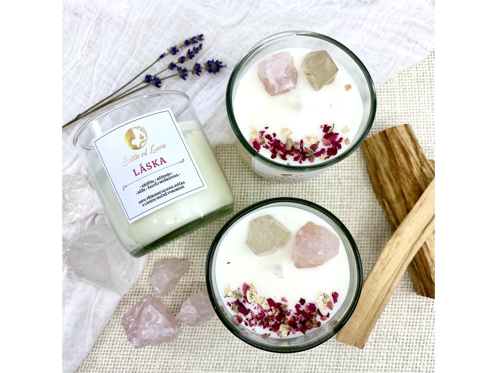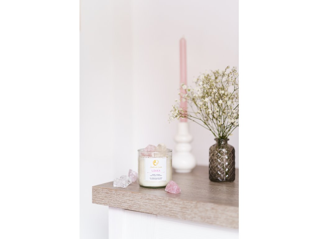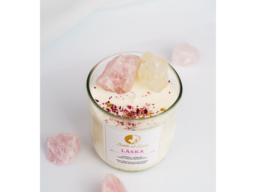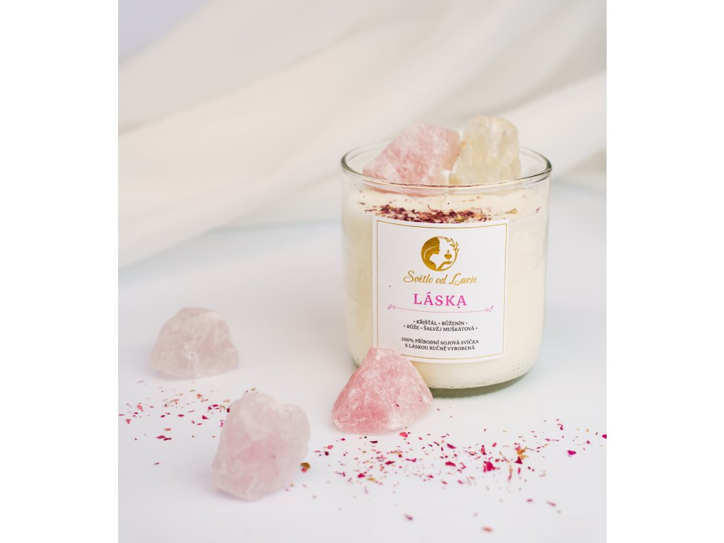 Ručně vyráběná sojová svíčka Láska s vůní růže a muškátové šalvěje jemně provoní váš domov.